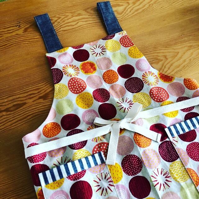 肩ひも後ろはHの形。おとなエプロン(赤系まるまる)