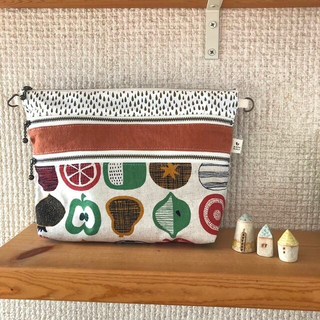 大きめな3ファスナーポーチ*ポシェットにも(くだものやさい)