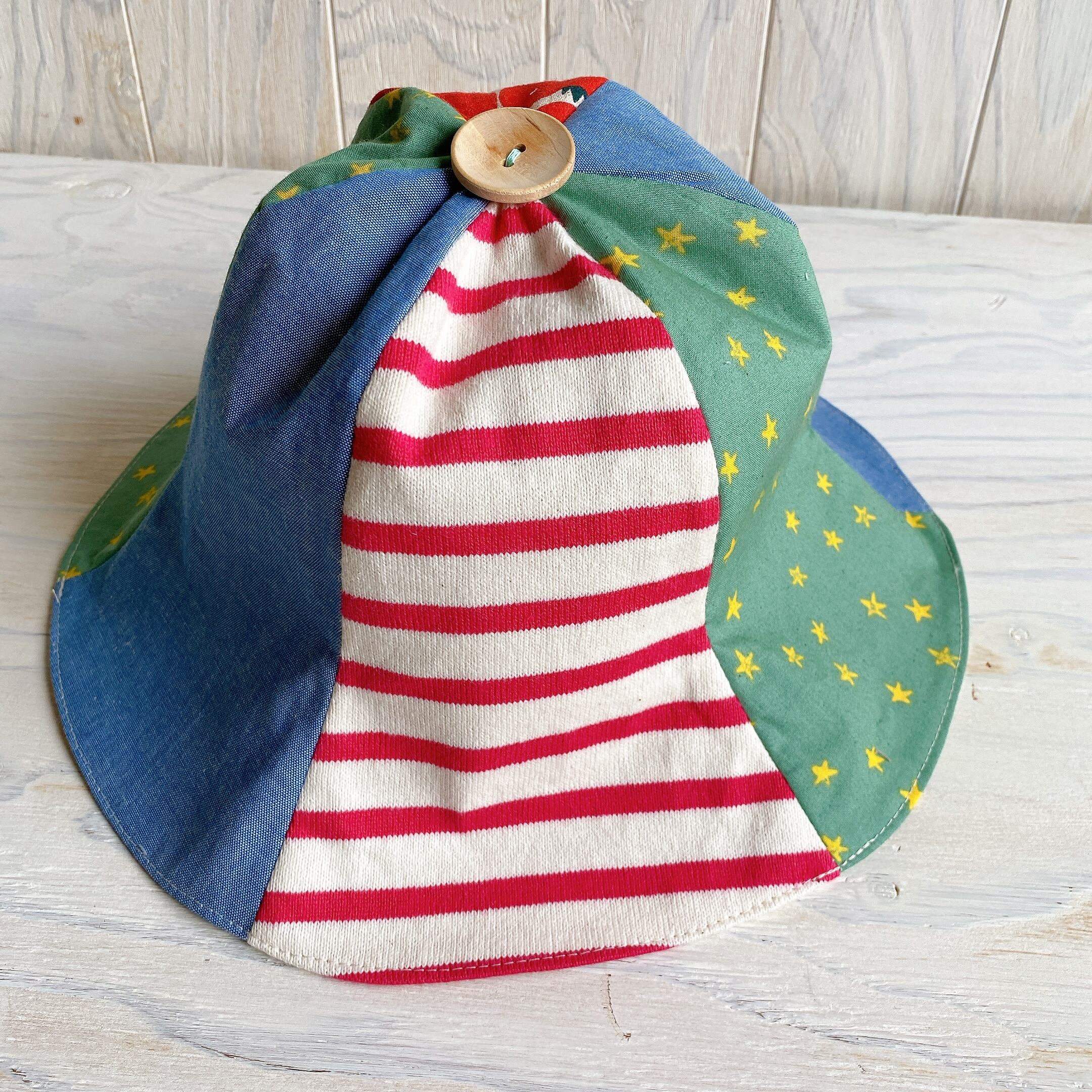 相性の良い3色の生地を組み合わせてチューリップハットにしました。